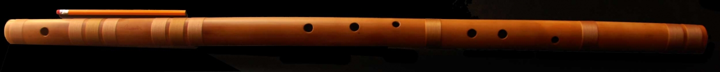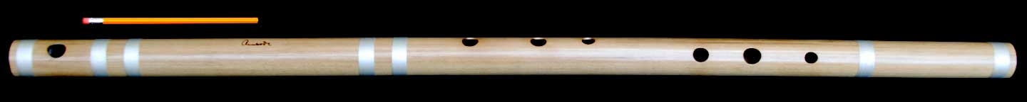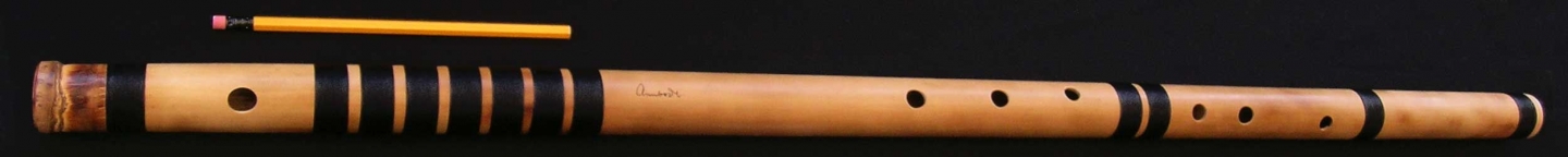 A very large and challenging to finger bansuri. Beautiful baritone voice with lots of transposition possibilities. Transpose Sa to Re (C#) and play Bhairavi with minimal half holing. Transpose to shuddh madhyam (E) and play Yaman to depict really low swaras, down to karaj Re and, in a 8-hole bansuri, even down to kharaj Sa.