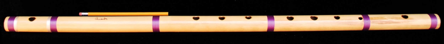 This is about the largest flute playable in Carnatic style especially because of the reach needed to cover the 7th hole. Very low pitched, deep and rich sound.